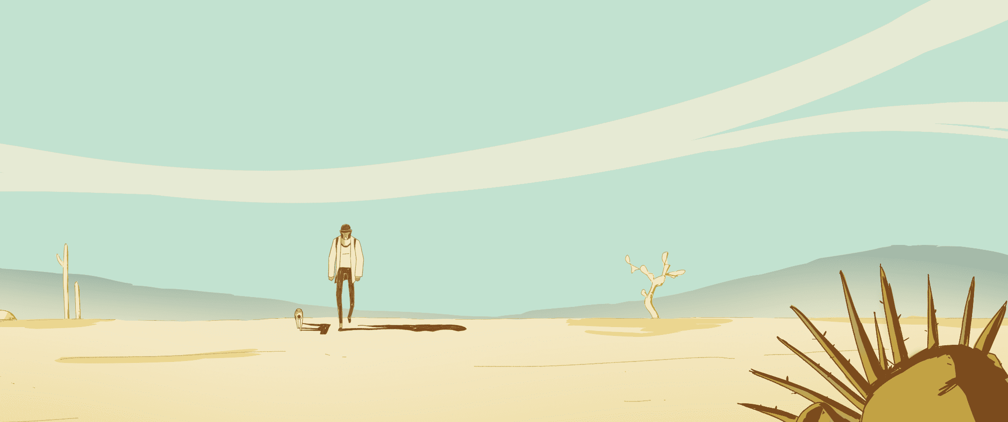 Un hombre y su perro atraviesan el desierto en busca de La Frontera, un caudaloso río que representa el límite geográfico con el territorio vecino. Agotados, consiguen divisar su meta, pero deben afrontar más obstáculos antes de conquistar sus aguas. |
