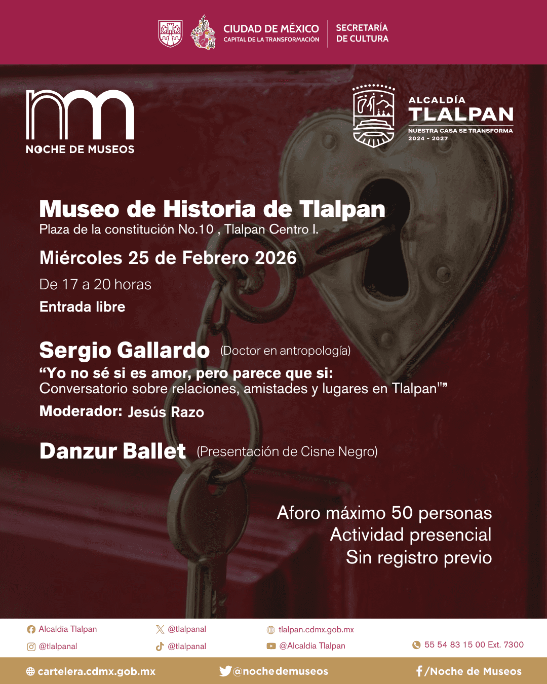 Te esperamos en noche de museos donde habrá un conversatorio y Danza Jazz. Sergio Gallardo García: "Yo no sé si es amor, pero parece que sí: Conversatorio sobre relaciones, amistades y lugares de Tlalpan". Moderador: Jesús Razo